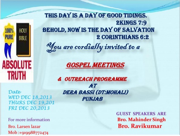 We have prayerfully arranged 3 days Gospel meetings & Outreach programme in Dera bassi (Dt:Mohali) Punjab. which is on Dec 18-20th of this month.Only 3 days are left and till now we couldn’t purchase full Bible and Gospel literature etc. and there are other needs also for these meeting and program me. we continually looking to the lord with faith.