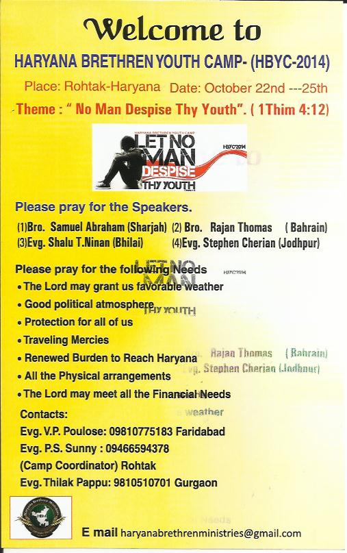 Haryana Brethren Youth Camp will be held on October 22 to 25, 2014 under the auspices of “Rohtak Brethren Assembly.”