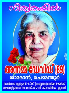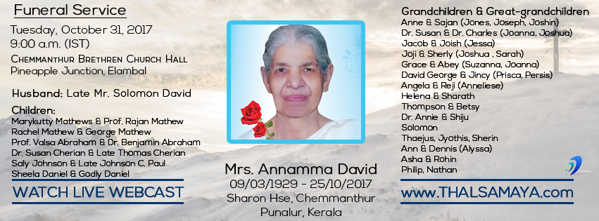 Sis. Annamma David (88 years) went to be with the Lord at 9:45 pm on October 25, 2017. She was not well for some time. It was well pleasing for our Lord to call her to the eternal home, where there is no pain, no sorrow, no tears, no sickness and no death. She was a member of Chemmanthoor Brethren Assembly, Punalur.