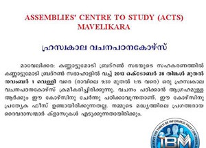 Mavelikara, Kerala: Assemblies Centre To Study (ACTS) in association with Kannaattumodi Brethren Assembly has arranged Bible classes from Oct 28 – Nov 1, 2013. Timings: 9:30am – 1:15pm Topics: 1, Jehovah Witness Teachings 2. Man’s nature and divine character 3. Christian Leadership 4. Church 5. Study on Romans 6. Charismatic movement 7. More...