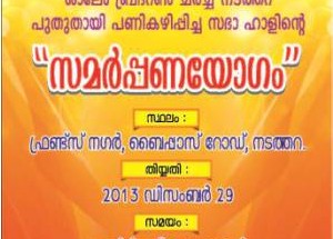 Nadathara, Thrissur: Shalem Brethren Church, Nadathara Assembly Hall Dedication Date: Dec 29, 2013 Time: 3:30 pm Venue: Friends Nagar, Bypass Road, Nadathara God’s servants Dr. Slias C. Nair, Thrissur, Evg. V. P. Paulose, Mannur, Bro. P. M. Mathukuttym Bangalore will lead the meeting For more info: +91 9995151049; +91 9847865316; +91 9961487578 [Adelphoi More...